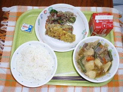 今日のメニューは、鯖のごま味噌焼き、ポテトサラダ、のっぺい汁、
