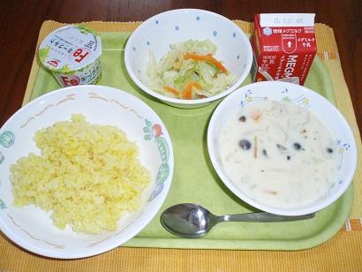 今日のメニューは、カレーピラフ、米粉シチュー、海藻サラダ
