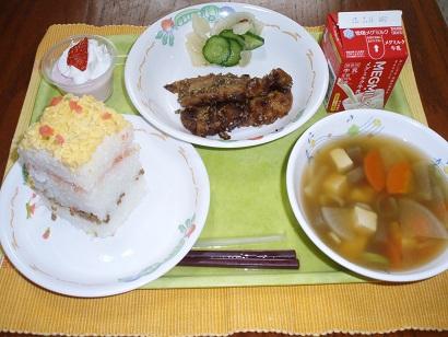 今日のメニューは、ちらしずし、ピーナッツ和え、沢煮椀、