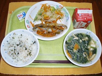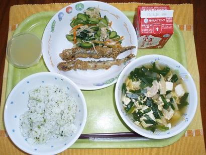6月1日(月)のメニューは、菜飯、ししゃものごま揚げ、ささみと胡瓜の辛子和え、