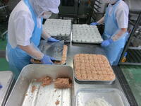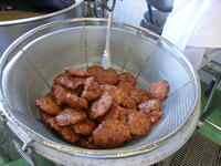 「豆腐の真砂揚げ」を作っている様子。形を作るクッキングシートへ並べる油で揚げる揚げあがり