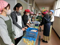 のっぺい汁に入る長ネギは、地元の農家さんと職業体験の生徒3人が一緒に納品に来てくれました。美味しいのっぺい汁になりました。