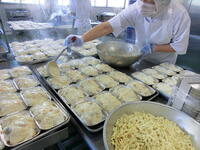 ご飯をケースに入れうえにホワイトソースをかけてドリアを作っている様子。