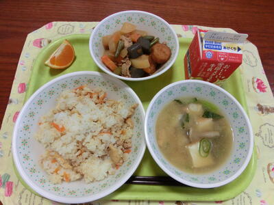 吹き寄せご飯は、秋に美味しいくり、さつまいも、しめじを鶏肉、にんじんと煮て御飯に混ぜ込みました。