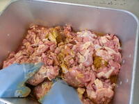 北中チキンカレー の鶏肉にカレー粉・ヨーグルト・赤ワインで下味をつけている様子。朝漬け込んでいるので肉が柔らかくジューシーになります。