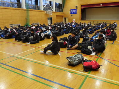 体育館で出発集会 バス到着 バス乗車