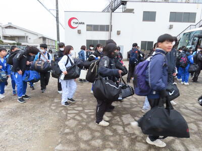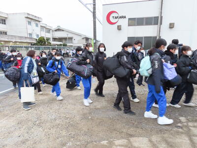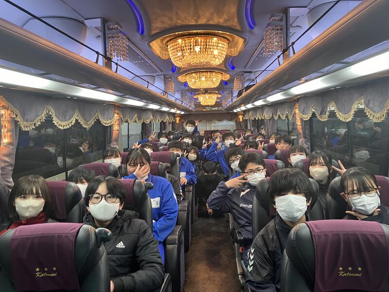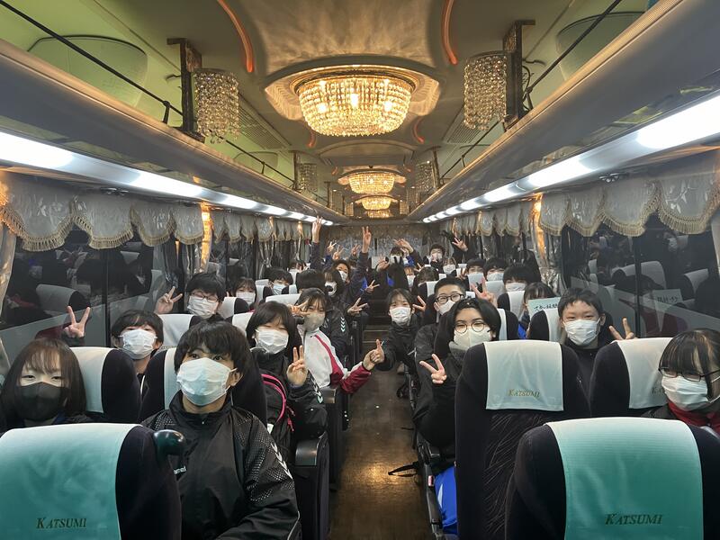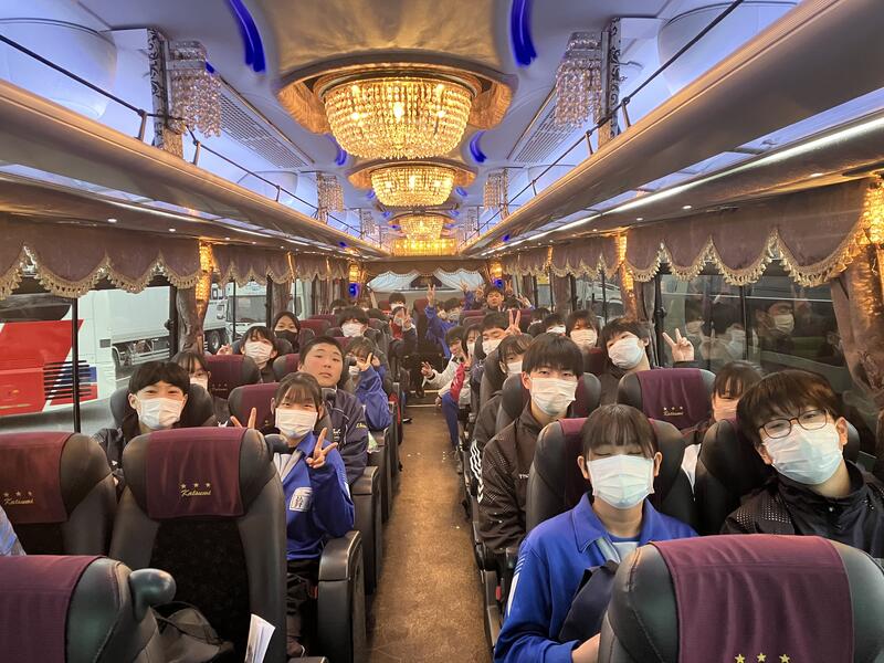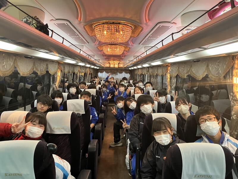 体育館での出発集会を終え、先程予定より10分程早く、学校を出発しました。