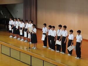第1回定期テスト2日目が終了しました。その後、生徒は体育館に移動し、生徒会の進行による全校集会を行いました。各部からの大会の報告、市内陸上競技大会と修学旅行の報告、そして生徒総会の振り返りを行いました。最後に来週22日(土)に行う『三世代交流の会』で披露する全校合唱の練習を行いました。全校生徒の声が重なり、厚みのある歌声が体育館に響きました。