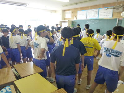 今週末16日(土)実施予定の体育祭に向けて、今日から練習がスタートしました。1時間目に体育委員長3-1鈴木真琴さんから体育祭に向けての心構えやスローガン達成に向けての取組について話がありました。また、シスター結団式が行われ、各色の団長から気合いの入った挨拶があり、応援団員やソーラン隊の生徒の自己紹介がありました。残念ながら、3時間目のシスター活動は、熱中症予防のため教室での活動になりましたが、初日にもかかわらず、それぞれのシスターが一致団結した姿を見せてくれました。
