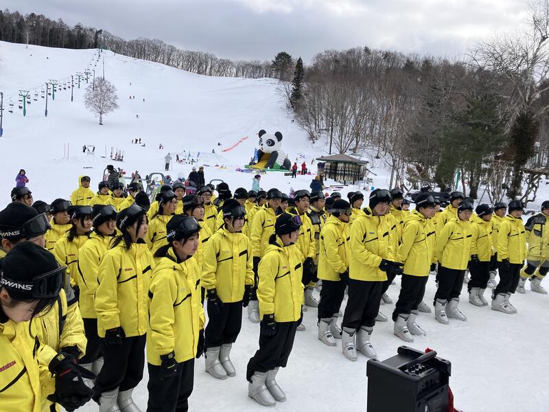 初日はブーツを履いたり、板を持ってみたり、つけてみたりと、初歩的なことからスタートしています。みんな、一生懸命にインストラクターの話を聞いて動いています。