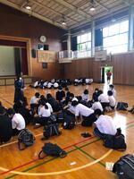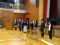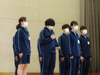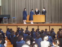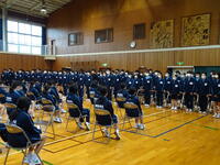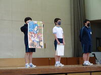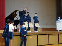 はじめに部活動や文化的活動に対する表彰を行い、続いて1年生の校外学習、3年生の修学旅行代替行事の発表がありました。さらに、委員会委員長の話や生徒会長の話の後、校長先生の話で集会は終わりました。