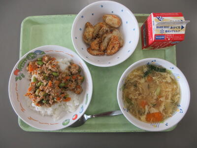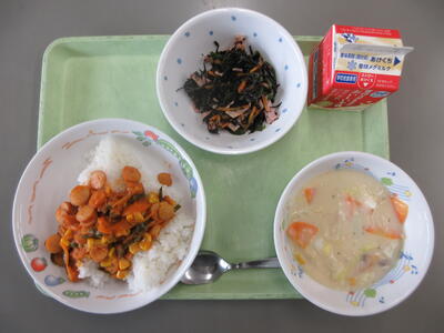 ・ご飯 ・牛乳 ・鯖のカレー焼き ・大豆とひじきの煮物 ・利休汁 ・よもぎ団子
