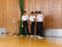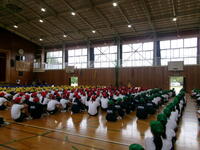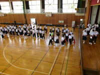 体育館で各組の応援団長を紹介した後、色別に結団式を行いました。応援団の紹介や先生の話など、早くも各組のカラーがあらわれていました。