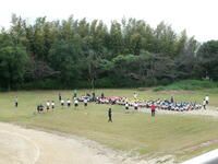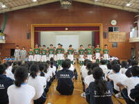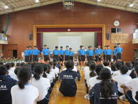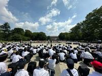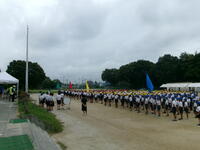 結団式が終わると、グラウンドで開閉会式の練習を行いました。応援団長の号令で一斉に入退場をして、並び順や移動後の自分の位置をしっかりと確認できました。