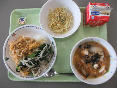 ・ビビンバ丼 ・牛乳 ・キムチとトックのスープ
