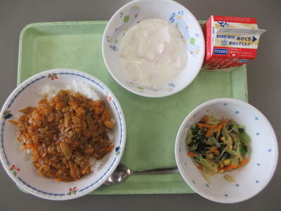 ・豆とひき肉のドライカレー ・牛乳 ・小松菜のジャコサラダ ・フルーツヨーグルト