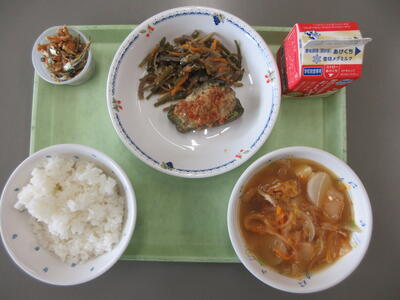・ご飯 ・牛乳 ・ピーマンの肉づめ ・茎わかめのきんぴら ・キムチとトックのスープ ・アーモンドカル