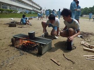 5月10日(土)土曜授業です。今日から検定試験の学習とNIE学習が始まりました。また、午後は部活動の結団式がおこなわれました。そんな盛りだくさんの中、2年生は来月の林間学校に向けて、飯盒炊飯の実習を行いました。薪を準備し、飯盒でごはんを炊いて、カレーを食べました。初めての人もいたようでしたが、協力しておいしいカレーができたようです。後片付けも含めて、林間学校での予習ができました。