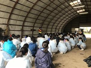 岩名中2年生の林間学校も最終日となりました。天候はあいにくの雨で、気温13℃と少し寒いかもしれません。しかし、子どもたちは疲れを見せること無く、元気に鷹山ファミリー牧場へ出発しました。今日は体験学習ということで、トラクターの操作や乳搾り、ブラッシングなどを体験します。