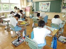 2年生が林間学校に出発し、女神湖で美味しい昼食を食べている頃、学校では給食試食会が行われました。今年は、なんと23名もの申し込みがあり大盛況でした。お父さん、お母さん方にも美味しい給食を味わってもらい、クイズで黒酢米をゲットし満足されて帰られる方やレシピを聞いて帰られる方もいらっしゃいました。