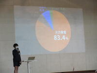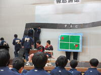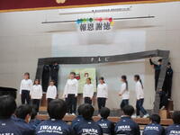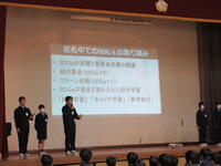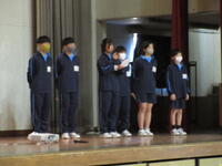 整備委員会・図書委員会の発表があり、整備委員長からは「無言清掃強調週間」についての報告がなされました。2週間に及ぶ取り組みの結果、全学年で大きな意識の向上、清掃の質の向上を感じ取ることができたという報告とでした。また、図書委員からは、貸出冊数の減少に伴う、取り組みについての発表でした。呼びかけを強化し、大きな貸出冊数の増加が見られたとの報告でした。