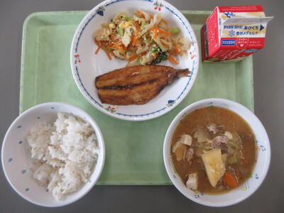 ・わかめご飯 ・牛乳 ・いわしのさんが焼き ・野菜のごま和え ・たぬき汁