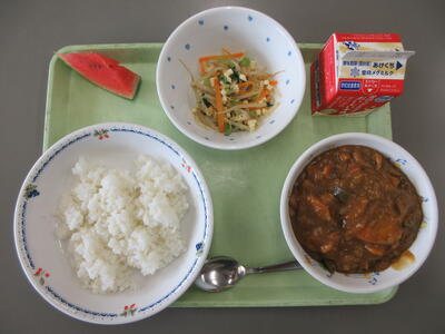 ・夏野菜カレー ・牛乳 ・青菜のチーズ和え ・小玉すいか