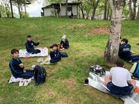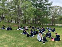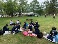 現在一行は、女神湖に到着しました。先ずは、到着後に記念撮影をして、その後は、お弁当タイムです。美味しく頂いてますね。この後は、ホテル到着後、隣接している白樺湖周辺にて、オリエンテーリングがあります。