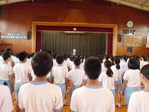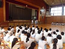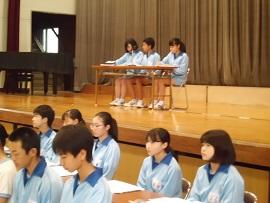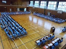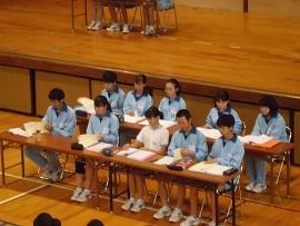 3年生が修学旅行を終え、2年生の林間学校も明日に迫りました。昨日、全校集会が行われました。市内大会の表彰では多くの部で入賞し、多くの生徒が表彰されました。今月の歌声は「翼をください」を全校合唱しました。委員会からの発表では生活委員会が衣替えに合わせて身だしなみについて発表しました。