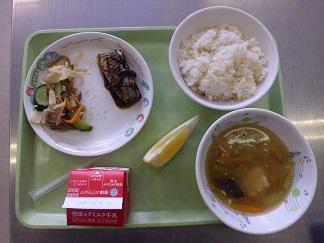発芽玄米、秋刀魚の松前煮、こんにゃくサラダ、豆腐入り団子スープ、河内晩柑、牛乳