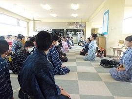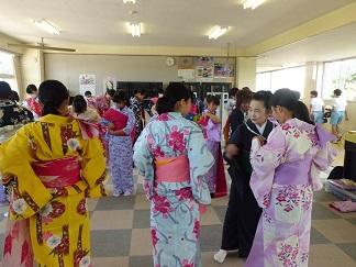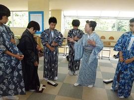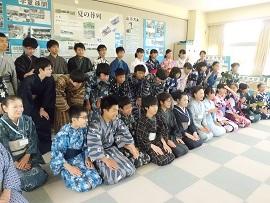 6月17日(月)家庭科の授業の一環として、講師に生井里美先生(他6名)を招いて、2年生を対象に浴衣の着付け教室が行われました。家庭科分野の衣食住の生活で「衣服の構成」があり、和服の着方を知るということで、実際に浴衣に袖を通し、正しい着方を教わり、日本の伝統文化に触れることができました。また、浴衣の着付けだけではなく立礼や座礼、立居振舞も教わることができました。男子も女子も浴衣がよく似合い、楽しみながら学習することができました。