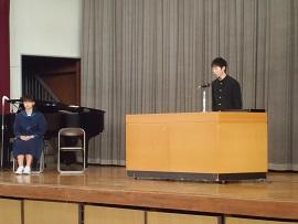 昨日、平成30年度の修了式と辞校式が行われました。修了式では校長先生から修了証が1年代表、戸塚佳菜子さんと2年生代表、黒沢琉生さんに渡されました。その後、後期を振り返り、1年生溝上颯人さん、2年生和田南帆子さんが発表しました。校長先生の話では、「プラス1・1UP」について話がありました。