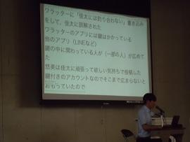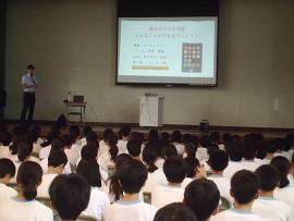 そして、午後からは情報モラル講演が開催されました。講師には、NPO法人企業教育研究会の竹内正樹 先生がいらっしゃり、ラインやツイッターなどのトラブルについてお話をいただきました。講演は授業形式で行われ、生徒に質問をしたり、グループで考える時間を与えたり、と生徒の反応もよく、実のある講演となりました。これを機に一人一人が安易な行動をとらないことを願います。
