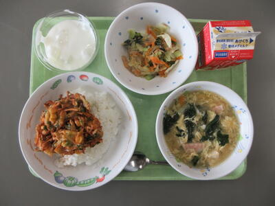 ・かみかみかき揚げ天丼・牛乳・ツナと小松菜のソテー・むらくもスープ・ナタデココ入りヨーグルト