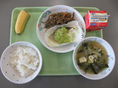 ・ご飯 ・牛乳 ・白身魚のずんだソース焼き ・五目きんぴら ・大根と小松菜のみそ汁 ・バナナ