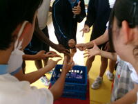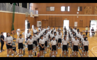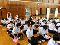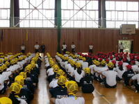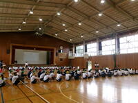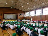 体育館で各組の応援団長を紹介した後、色別に結団式を行いました。応援団の紹介や先生の話など、早くも各組のカラーがあらわれていました。