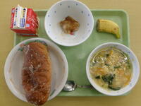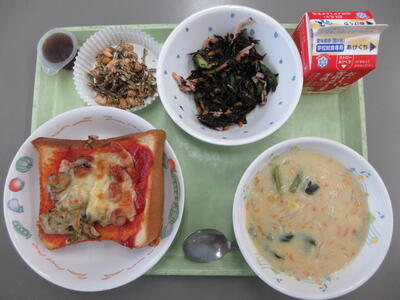 ・ピザトースト ・牛乳 ・ひじきのマリネ ・コーンポタージュ