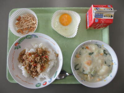 ・ガパオライス ・牛乳 ・チンゲンサイの米粉クリームスープ ・ミックスナッツ
