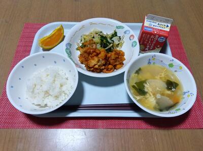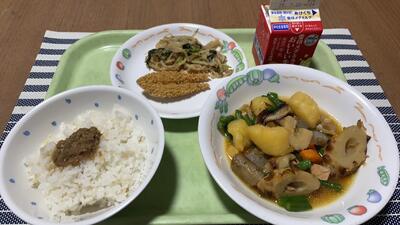 五目鶏飯 牛乳 大学芋 小松菜のおひたし