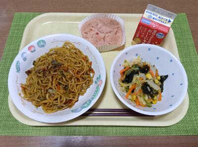 ソース焼きそば 牛乳 わかめサラダ