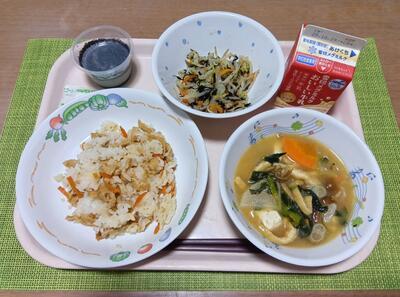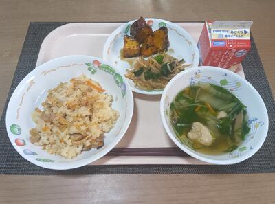 五目鶏飯 牛乳 大学芋 小松菜のおひたし