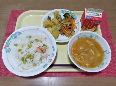 鮭と枝豆のご飯 牛乳 ごまポテト 柚香和え