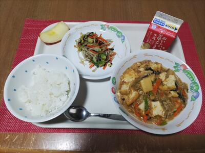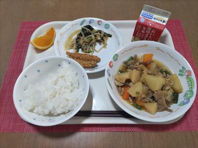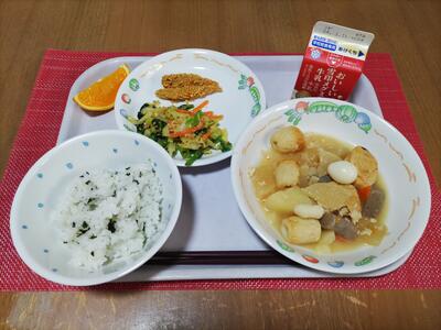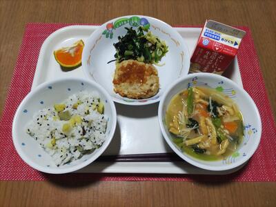 さつまいもご飯、牛乳、豆腐ハンバーグ、