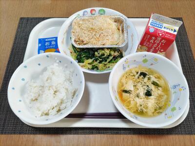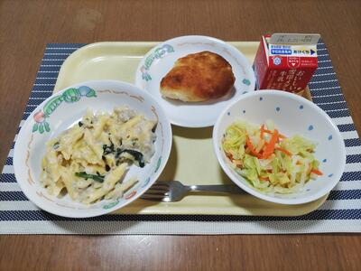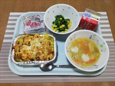 えびドリア、牛乳、小松菜とコーンのソテー、