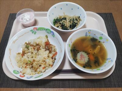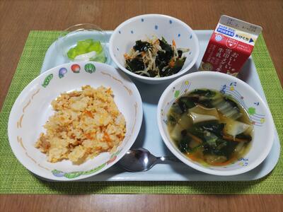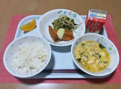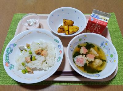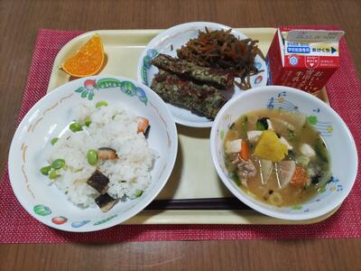 鮭と枝豆のご飯、牛乳、ちくわの磯辺揚げ、