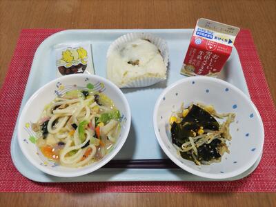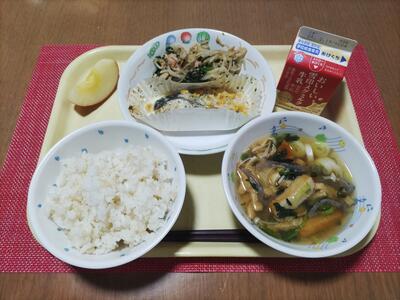 発芽玄米ご飯、牛乳、秋の味覚焼き、