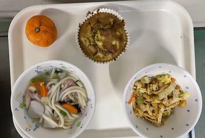 本場の時うどんは、具の入っていない汁だけのうどんですが、今日の給食では沢山の野菜が入ったうどんになっています。