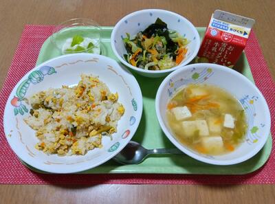高菜ご飯、牛乳、こんにゃくサラダ、