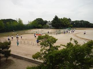 川間中の体育館で男子バレーボール部が試合です。校庭では、サッカー部が