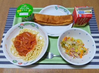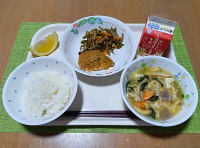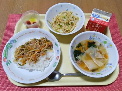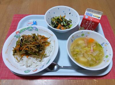 きんぴら丼、牛乳、野菜ののり酢あえ、